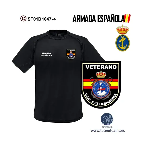 Camiseta Buque Hespérides A-33 – Armada Española, puedes adquirirla en modelo bandera en los colores marino y blanco, y el modelo liso en marino, negro y blanco.