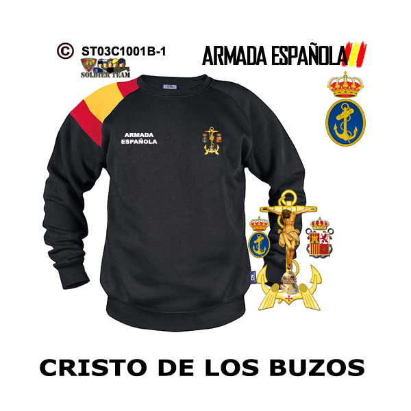 Sudadera-bandera Cristo de los Buzos Armada Española, puedes adquirirla en los colores marino, negro y blanco para que elijas la que mas te gusta.
