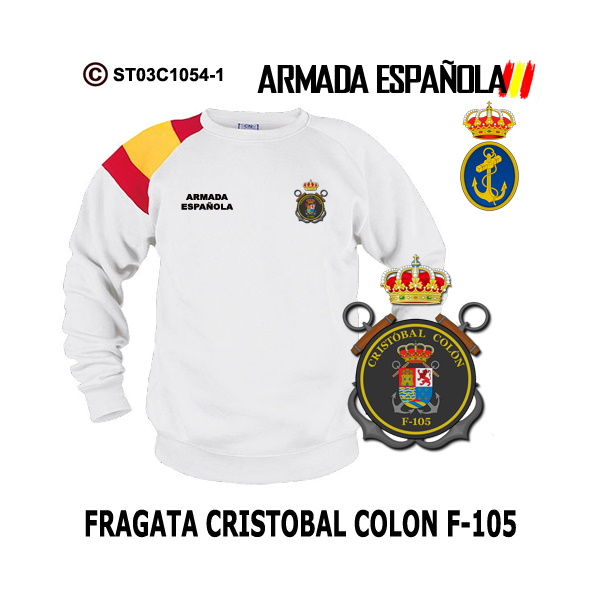 Sudadera-bandera Fragata Cristóbal Colon F-105 – Armada Española, puedes adquirirla en los colores marino, negro y blanco para que elijas la que mas te gusta.