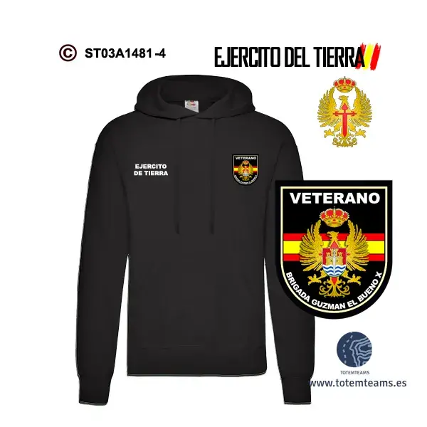 Sudadera-capucha Brigada Guzmán El Bueno X, puedes adquirirla en los colores negro, marino y blanco para que elijas la que más te gusta.