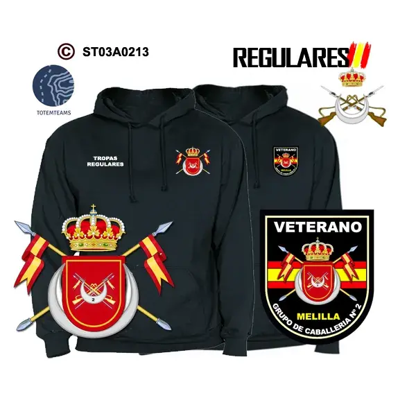 Sudadera-capucha Melilla Grupo de Caballería Nº2 – Regulares, puedes adquirirla en los colores marino, negro y blanco para que elijas la que mas te gusta.