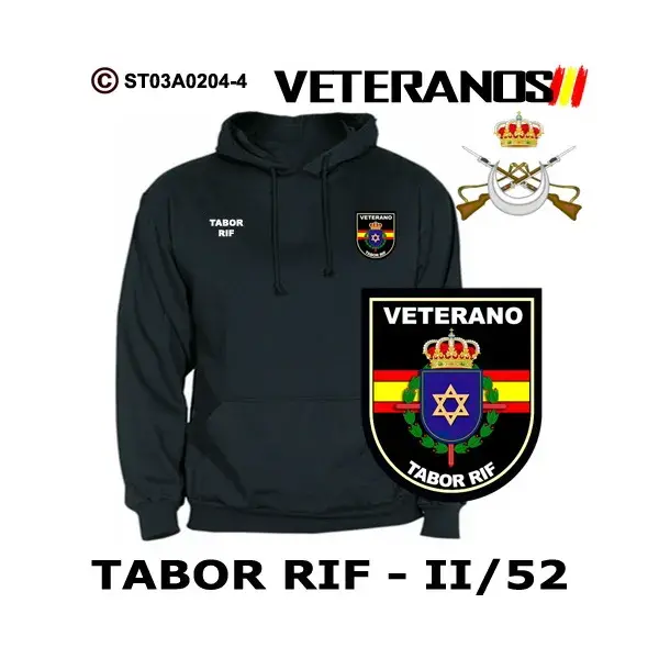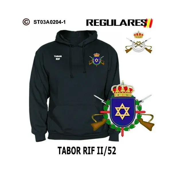 Sudadera-capucha Tabor Rif II/52 Grupo de Regulares, puedes adquirirla en los colores marino, negro y blanco para que elijas la que mas te gusta.