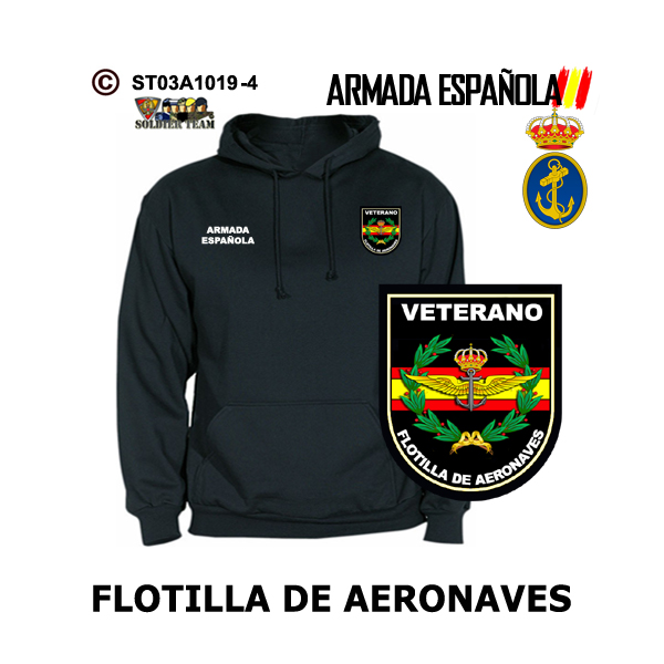 Sudadera-capucha Veterano de Flotilla Aeronaves Armada Española, puedes adquirirla en los colores marino, negro y blanco para que elijas la que mas te gusta.