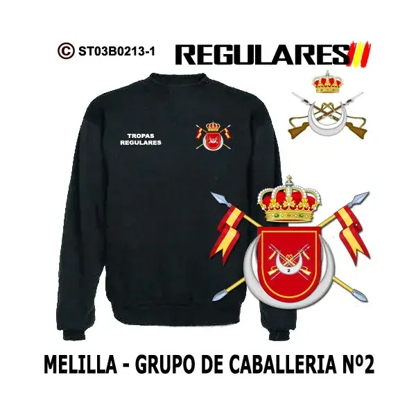 Sudadera-clásica Melilla Grupo de Caballería Nº2 – Regulares, puedes adquirirla en los colores marino, negro y blanco para que elijas la que mas te gusta.